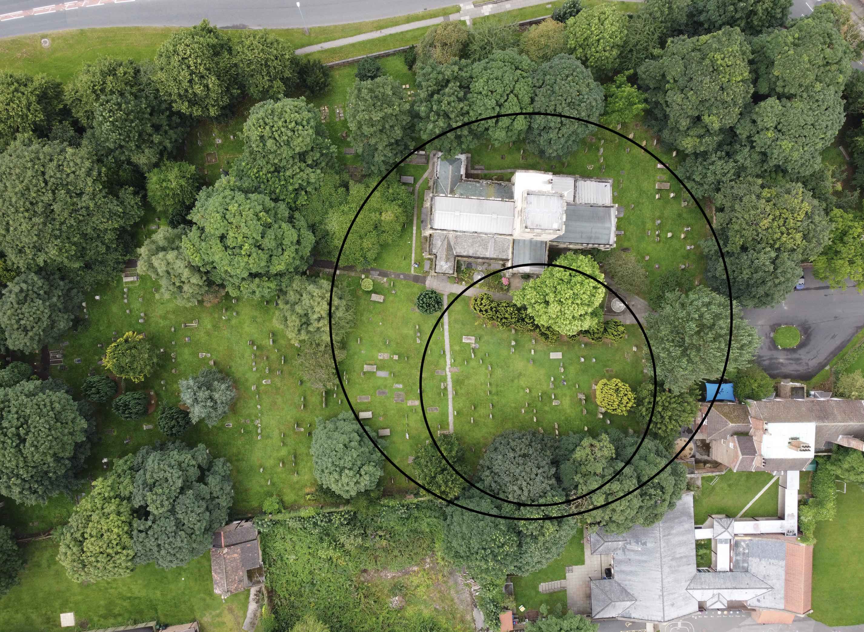 From summer 2021 until late 2022, TAS members surveyed and recorded 142 of the surviving grave monuments in the churchyard of St Mary the Virgin, Norton: its full name being THE COLLEGIATE AND PARISH CHURCH OF ST MARY THE VIRGIN, OUR LADY OF THE ASSUMPTION. The results are summarised below, along with brief biographies of those interred, and with reports earlier published in BULLETIN No.25, 2022. The inner circle on the photo shows the area recorded in 2021; the outer circle that recorded in 2022. All three reports, below, are available as downloads.
